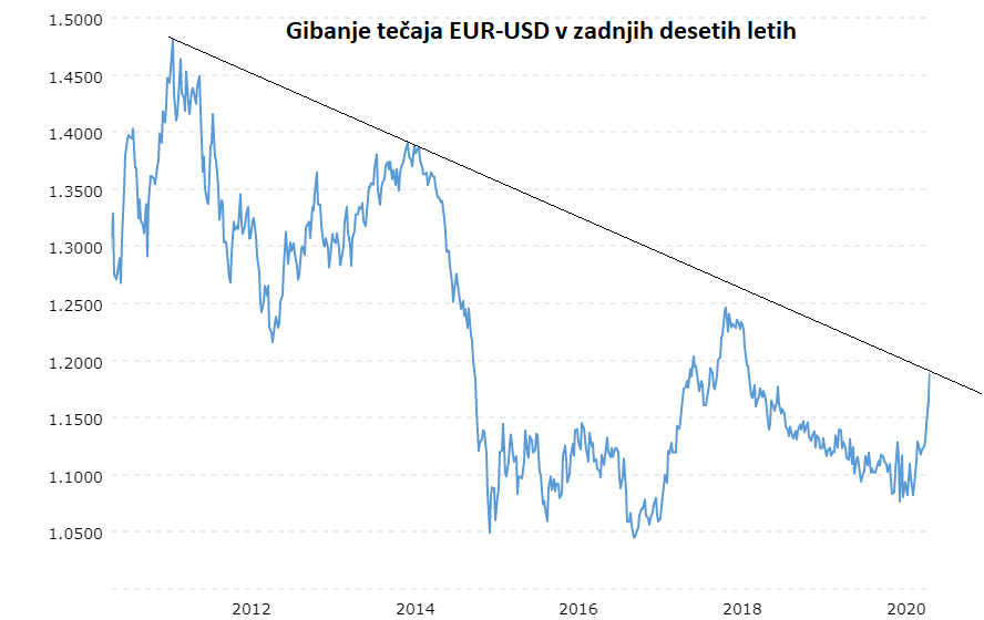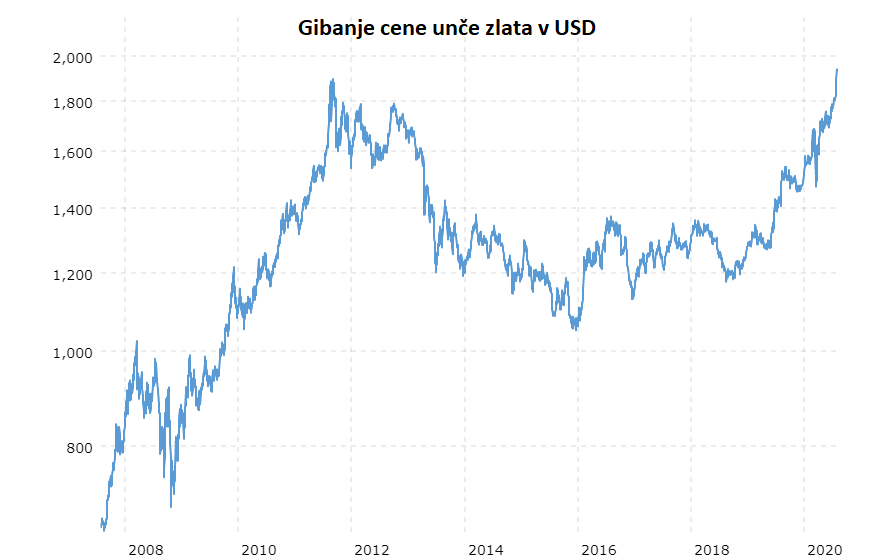 Ravno nasprotno se je seveda gibala cena zlata, ki mesec zaključuje na najvišjih zgodovinskih ravneh okrog 1.975 USD za unčo. Zadnji vrh je zlato beležilo avgusta 2011 pri vrednosti 1.900 USD in je nato počasi drselo vse do vrednosti 1.100 USD decembra 2015. Od takrat dalje je v ponovnem vzponu, ki je prav minuli teden naposled prebil prejšnji, skoraj devet let star rekord.