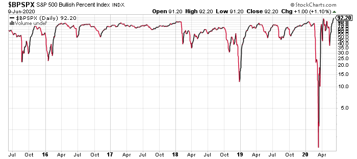 Velika večina tehničnih indikatorjev je globoko v evforičnem, overbought območju. Nekatere vrednosti so na zgodovinskih ravneh. Na priloženi sliki lahko vidite kazalnik optimizma vlagateljev na primeru indeksa S&P500 (S&P500 Bullish percent index). Po marčevskem paničnem dnu, kjer praktično ni bilo enega optimista na borzah, smo po dveh mesecih v diametralno nasprotni situaciji. Danes tako ni več moč najti enega pesimista na borzah. Gre za ekstremni zasuk sentimenta vlagateljev. Če je bila torej panika sredi marca razlog za manjši optimizem in pričakovanje vsaj kratkoročnega popravka, ki se je dejansko tudi zgodil, je današnja situacija znova razlog za previdnost.