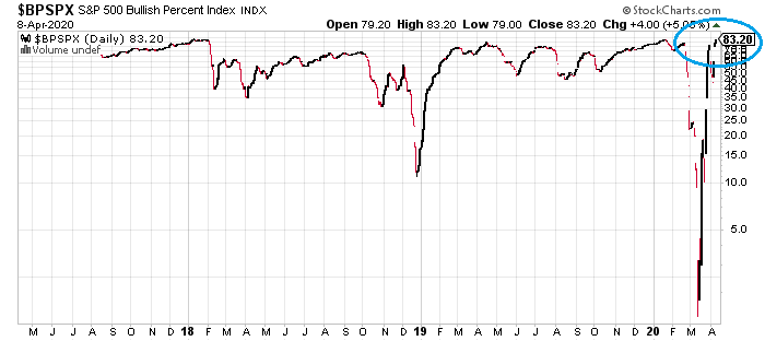 Ameriške borze (sledijo pa seveda tudi ostale) so se po dveh tednih naposled povzpele do sredine ravni popravka, ki smo ga napovedali v našem predhodnem poročilu. Pretirano panična, oversold situacija iz konca marca se je na ta način očistila, kar se lepo vidi tudi iz priloženega grafa razmerja med bikovsko in medvedje razpoloženimi vlagatelji (Bullish Percent Index).