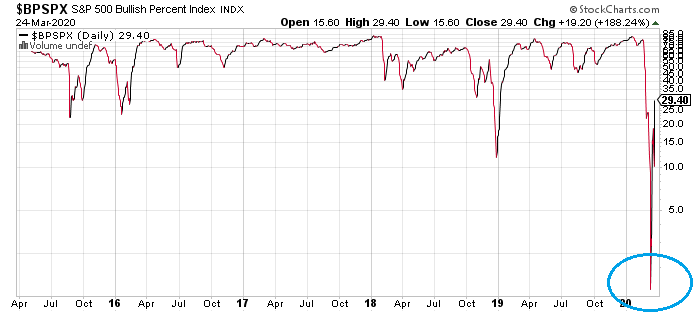 Borze so naposled dočakale pozitivni odboj, ki smo ga napovedali v našem predhodnem članku. Negativna panika, popolna razprodaja in posledično globoko »oversold« območje so bili namreč v zaključku predhodnega tedna že tako izraziti, da je bil odboj v drugo smer samo še stvar dneva. Nobeno dogajanje se namreč ne odvija v ravni črti, borze pa še najmanj. Na grafu lahko vidite kako je nivo bikovsko (pozitivno) razpoloženih vlagateljev prejšnji teden hitro in dramatično upadel na zgodovinsko nizke ravni. Na borzah praktično ni bilo več optimistov.