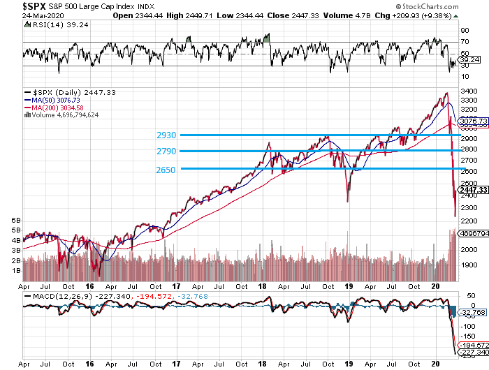 Trenutna tehnična slika je sedaj sledeča. Na priloženem grafu indeksa S&P500 smo z vodoravnimi modrimi linijami označili tri pomembna odporna mesta, kjer se utegne ta pozitivni popravek ustaviti. Gre za t.i. Fibonaccijeve ravni, ki predstavljajo 38,2%, 50% in 61,8% odboj med vzpostavljenim začasnim dnom in predhodnim vrhom. Ni rečeno, da bomo do teh ravni sploh prišli, a ti nivoji so najverjetnejši, glede na obseg padca. Šele ko indeks premaga vse tri ravni, se lahko začnemo pogovarjati o morebitnem ponovnem napadu na januarski vrh oziroma ponovni vzpostavitvi bikovskega trenda. A do tja je še zelo dolga pot in glede na tehnično škodo, ki je bila v zadnjih štirih tednih storjena na trgih, skorajda nemogoč podvig. Sedaj je namreč že dejstvo, da recesija bo, fiskalni in monetarni ukrepi jo bodo le nekoliko ublažili, da številke ne bodo tako dramatične, kot so se v zadnjih dneh pojavljale v medijih. Posledično se bo znižala splošna raven profitabilnosti podjetij, to pa je tisto kar šteje pri dolgoročnih vrednotenjih na delniških trgih. Pozna zrela faza gospodarskega cikla se je vlekla že slabi dve leti, koronavirus je sedaj le pospešil sicer neizogiben prihod recesije.