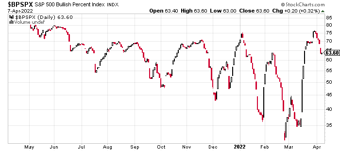 Na priloženi sliki lahko opazujete dogajanje, povezano s trenutnim sentimentom vlagateljev. Gre za ameriški kazalnik S&P500 Bullish Percent Index, ki kaže moč (trend) bikovsko naravnanih vlagateljev – optimistov (vezan je na delnice, ki sestavljajo ameriški borzni indeks S&P500). Na grafu je jasno vidno, da ta trend že dobro leto dni postaja čedalje šibkejši, dno pa je bilo zaenkrat doseženo konec februarja, takoj po izbruhu konflikta v Ukrajini. Po dobrih dveh tednih je v marcu sledil močan popravek, ki je do konca meseca znova dvignil optimizem vlagateljev, celo do najvišjih ravni v zadnjem letu dni. V prvih dneh aprila se sentiment na borzah počasi znova poslabšuje.