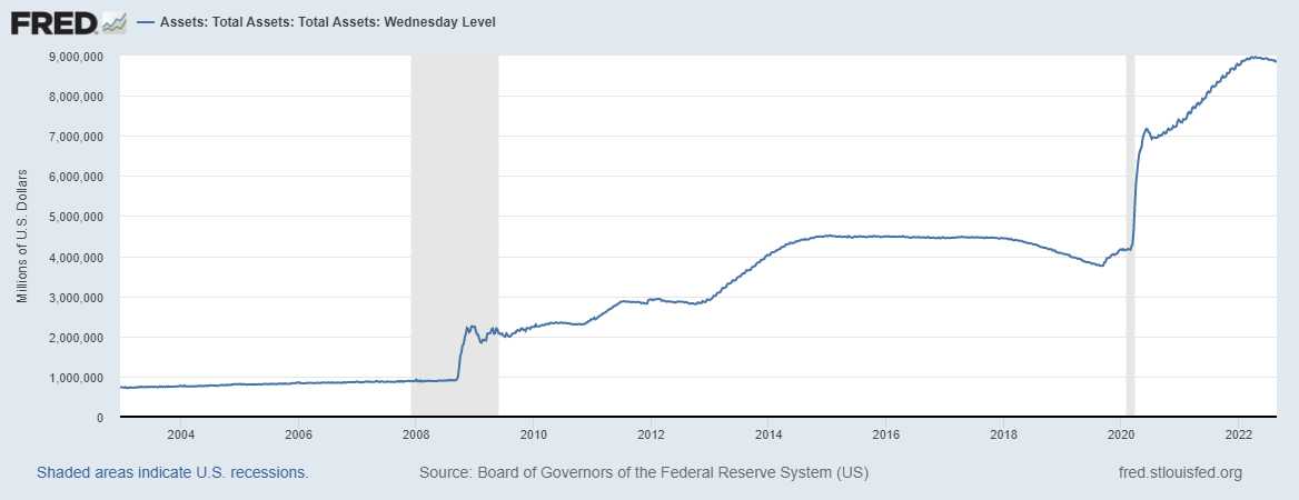 Na priloženi sliki lahko vidite bilančno vsoto ameriške Federal Reserve in občudujete količino presežne likvidnosti, ki je bila v zadnjem desetletju vnešena v finančni sistem. V najtežjem delu koronske krize avgusta 2020 je ameriška centralna banka celo predstavila novo usmeritev monetarne politike, temelječo bolj na spodbujanju zaposlovanja pod predpostavko, da inflacija še dolgo ne bo problematična (»This change may appear subtle, but it reflects our view that a robust job market can be sustained without causing an outbreak of inflation,« je dejal Jerome Powel avgusta 2020).
