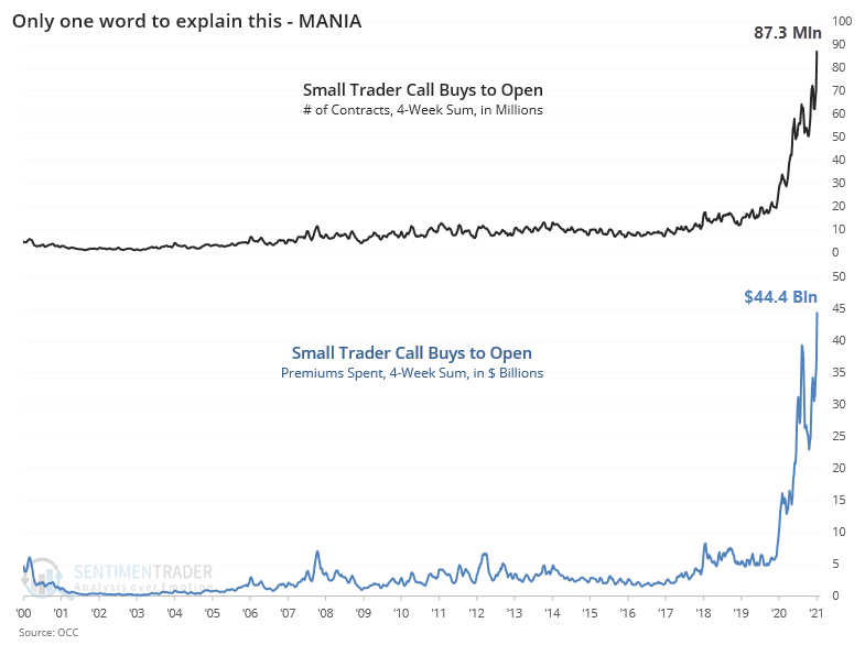 Centralne banke lahko sedaj v živo opazujejo kar so skuhale. Ker je likvidnosti na trgih preveč in traja predolgo časa, so ti poleteli in se močno odmaknili od fundamentalnih indikatorjev vrednotenj. Predvsem to velja za ameriške, kjer se tudi odvija aktualna zgodba. Več kot 100% dnevna rast delnic manjših, manj znanih podjetij, ki so poleg tega še pogosto v poslovnih težavah, je obenem pokazatelj, da je trg vse bolj pod vplivom impulzivnih vlagateljev kot tistih racionalnih. Nestabilnost finančnega sistema narašča. Kar se nas tiče dodajamo le opozorilo, da v zadnjih tednih krivulje rasti določenih indikatorjev sentimenta prehajajo v parabolično fazo. V predhodnem članku smo vam že prikazali dva taka, tokrat lahko omenimo še denimo obseg dolga za trgovanje na borzi (margin debt) ali pa morda nakupe delniških call opcij, kar lahko spremljate na priloženi sliki (vir: sentimentrader). Z eno besedo: previdno!