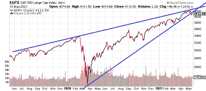 Tokrat le kratka osvežitev dogajanja v zadnjih dneh. Pomembnejše borzne indekse je sredi tedna malce vznemirila objava letne stopnje inflacije v ZDA. Večje škode zaenkrat ni storjene, se pa indeksi bližajo pomembni točki odločitve, kot lahko vidite na priloženi sliki gibanja ameriškega indeksa S&P500.