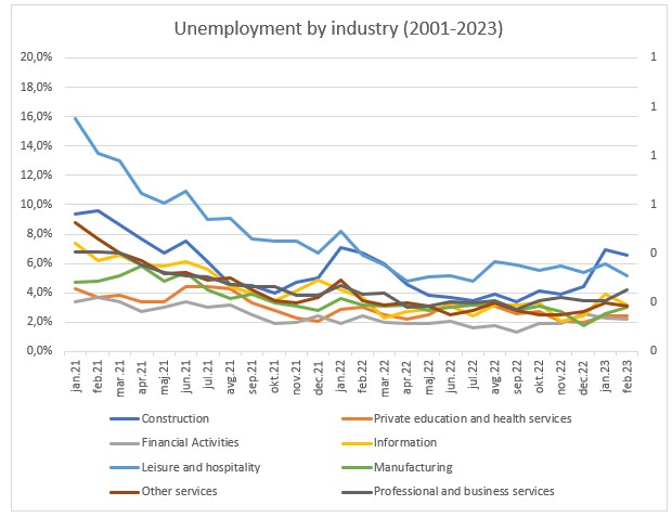 The chart, which starts in January 2021, shows lowering unemployment rates across all sectors. Particularly the leisure and hospitality sector has recovered tremendously due to the reopenings. Notice also that the financial sector and private education and health services sector hold the lowest unemployment rates at just 2,2% and 2,4% respectively.